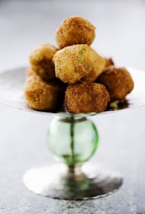 - Ta upp det friterade med hålsleven och låt det rinna av på hushålls- eller tidningspapper någon minut. Servera helst på momangen, men om det krisar sig varmhåller du det färdigfriterade i 125 graders ugnsvärme. Inte längre än 15 minuter, då blir det bara trist och saggigt.