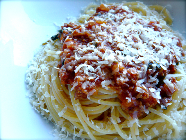 - Plocka bladen av basilikan och rör ner i såsen tillsammans med spenaten. Servera med spaghetti och riven parmesan.