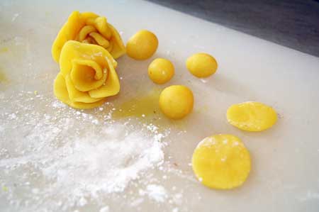 Det är inte svårt att göra dem. Med små kulor i olika storlekar får man lagom fördelning på bladen. Platta till de små kulorna och använd florsocker som “mjöl” om marsipanen är fuktig och kladdar. Gör plattorna till kronbladen rätt tunna. Sedan viras bladen omlott om varandra, inte alltför tajt. De blir bättre efter hand så övning ger färdighet. Ta av den del som blir tjock i botten av blomman och gör fler blommor.