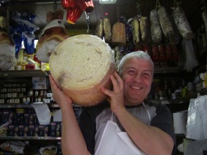 Vi hade undrat vad det var han stod och kramade. Det var Osten själv, denna cacio occhiato som kommer från Avellino. Varje ost väger tjugofem kilo och lagras i arton månader. I famnen höll han ungefär en tredjedels ost.  Skalet var hårt som gammalt läder, men inuti var den mjuk och saftig. Han  fick byta kniv för att ta sig in, men så bjöd han oss att smaka. Mmm… gudomlig. Första smaken är mild, men sedan kommer en rad toner, och till sist ett litet skarpt bett. Den är som havarti, fast utan fotsvett, eller som emmentaler, fast med karaktär. Där finns en sälta, också, och en hel orgel av alldeles egna smaker. Det är (sade maken) en smak man inte kunnat tänka sig fann. Så lyrisk blir man. Så är det inte heller vilken ost som helst, utan ”una cosa seria”, som osthandlaren sa. En allvarlig sak.