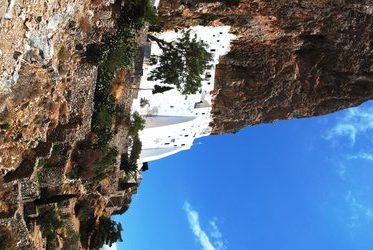 En av de varmaste dagarna på Amorgos beslöt vi att vandra upp för de branta trapporna till klostret Panagia Chozoviotissa. Det låg 300 meter över havet ovanför Agia Anna och såg ut som det vore spritsat i sockerkristyr på den branta bergväggen.
