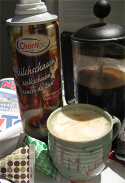 Och till min förvåning, kan jag meddela, var det inte riktigt så gräsligt som man kunde vänta sig. 100% originalmjölkskum, 0% fett låtersom ett recept på katastrof men är mest… intetsägande. Smakar inget. Luktar inget. Utseendet är värst, för när skummet ringlar sig ut är det otroligt likt rakskum – kritvitt, tätt och blankt i en smal korv. Men efter någon minut ovanpå kaffevärmen och lite försiktigt runtpetande med en sked liknar slutresultatet iallfall skummet på en latte från en “barista” av den slarvigare sorten.