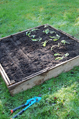 Den här tiden på året innebär ju en febril aktivitet för alla som har en plätt eget gräs utanför dörren, och jag är inget undantag. Förutom meditativa sysslor som att kratta löv och katapultera bort kryddörtsmumsande sniglar (av någon anledning så älskar de salvia) så långt det bara går eller åtminstone till grannens tomt så har Magnus och jag tämligen ljudligt snickrat ihop en aningen ranglig och väldigt hemgjord pallkrage för säsongens odling.
