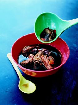 3. Koka upp 2 l vatten med alla soppingredienser utom revbensspjällen. Vänd ner revbensspjällen och koka upp på nytt. Låt sjuda under lock ca 2 timmar, tills köttet nästan faller av benen. Skumma av ytan ett par gånger under tiden. Tillsätt mer vatten om det behövs. Om du vill kan du fiska upp revebenen och sila av soppan. Jag föredrar att låta kryddorna simma med i soppskålen.