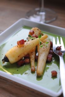 - Tärna fläsket fint. Hetta upp palsternackor med smör och olja i en teflonpanna (helst med ett lock till). Fräs på medelvärme ett par minuter. Tillsätt fläsket och fortsätt fräsa på svag värme tills palsternackorna mjuknat och fått en lätt gyllene yta. Klicka i mer smör om det behövs.